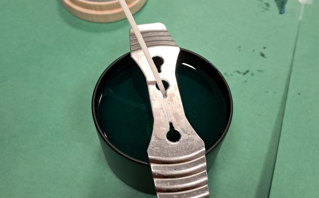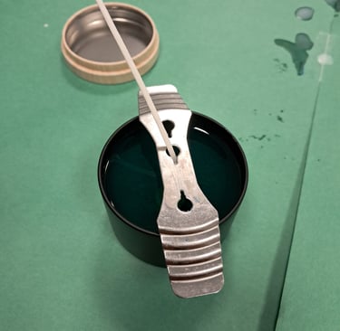 Start by heating up the candle wax to 165 degrees Celsius in a pot or pan. For one candle we used about 100g of wax. Then we put some glue on the bottom of the wick and put it in our heat-resistant container.